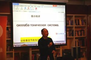 随后,便切入讲座主题——俄诗的格律。他指出,要想提高诗歌的鉴赏水平,必须弄懂诗歌的节奏,找到逻辑重音,体会诗歌的抑扬顿挫。俄诗的格律基础是轻重音节的有序交替。接着,汪先生通过中俄诗歌对比,风趣幽默地讲解了俄诗格律的重要元素:音部、诗行、尾韵和诗节,并对其中的抑扬格和诗行格式做了重点阐释。期间,他还为大家播放了自己朗读的诗歌录音,讲述了许多有趣的故事。