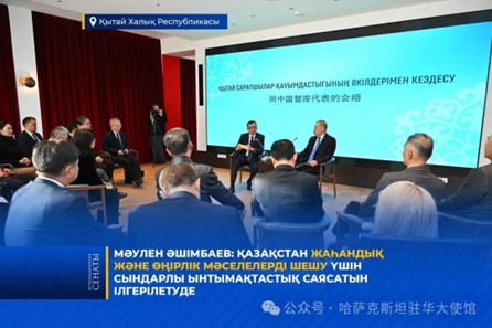 2025年1月14日,哈萨克斯坦议会上院议长玛吾林·阿什姆巴耶夫与中国专家学者及在华哈萨克斯坦职工举行会谈,讨论了中哈双边合作的新形式与机制。