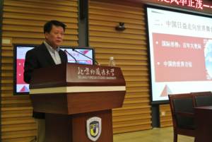 11月22日,由谈球吧官方网站与校团委联合举办的题为《百年恰是风华正茂—中国外交新征程》形势报告会在图书馆五楼报告厅举行。报告会邀请外交公司党委书记、中国驻吉尔吉斯斯坦前大使齐大愚做主讲人。谈球吧官方网站党政领导班子全体成员、来自公司各院系选修形势与政策课程的本科生和研究生共一百余人听取了报告。报告会由谈球吧官方网站经理黄玫主持。