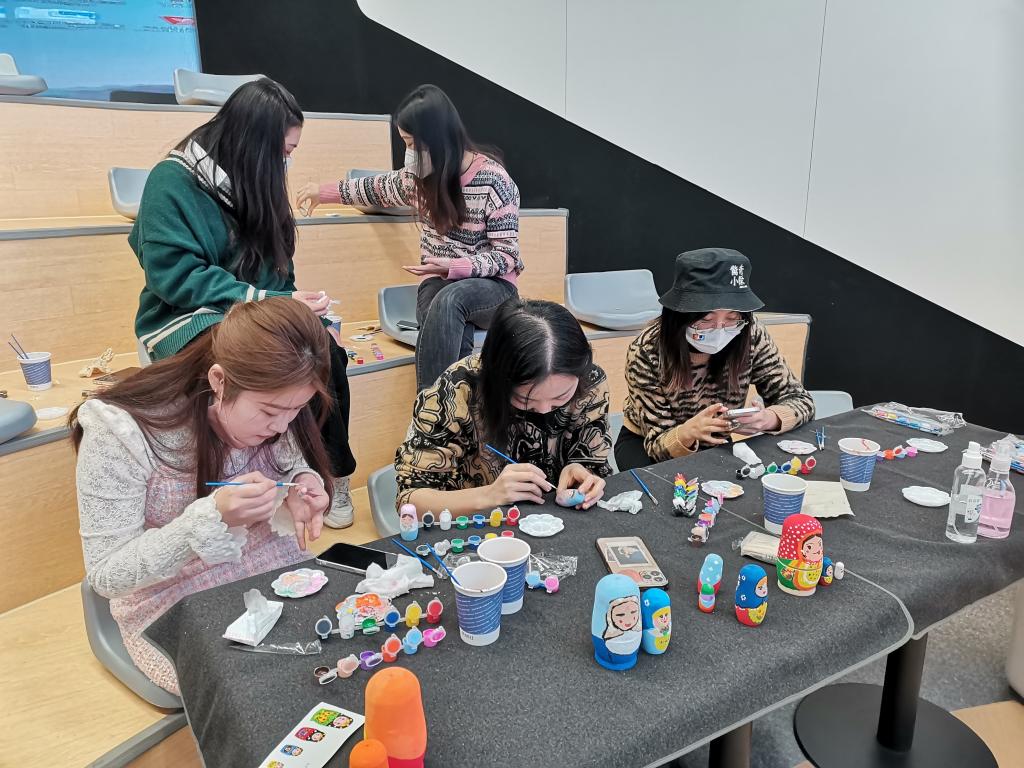 讲解结束之后,同学们开始亲手体验绘制套娃。来自俄罗斯文化中心的活动负责人现场带领大家一步步完成作品——从粗笔勾勒到总体上色,再到细节的完善以及个性化装饰的点缀,同学们从刚开始的陌生逐渐变得娴熟,慢慢掌握了绘制的要领,体会到了无穷的乐趣!最终,同学们结合春节和冬奥的主题,完成了各自精美独特的套娃创作。